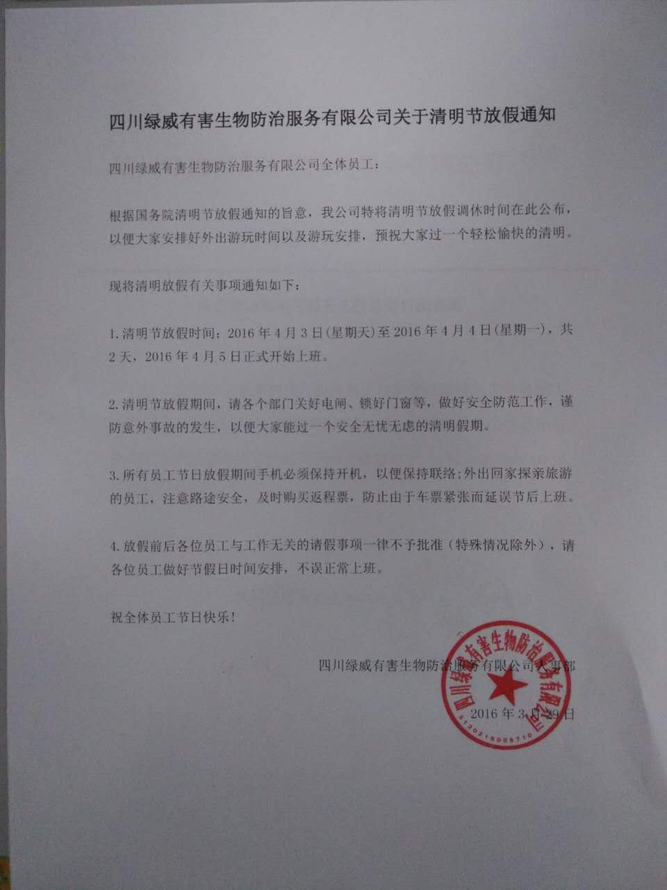 绿威防治国庆放假通知及值班人员安排