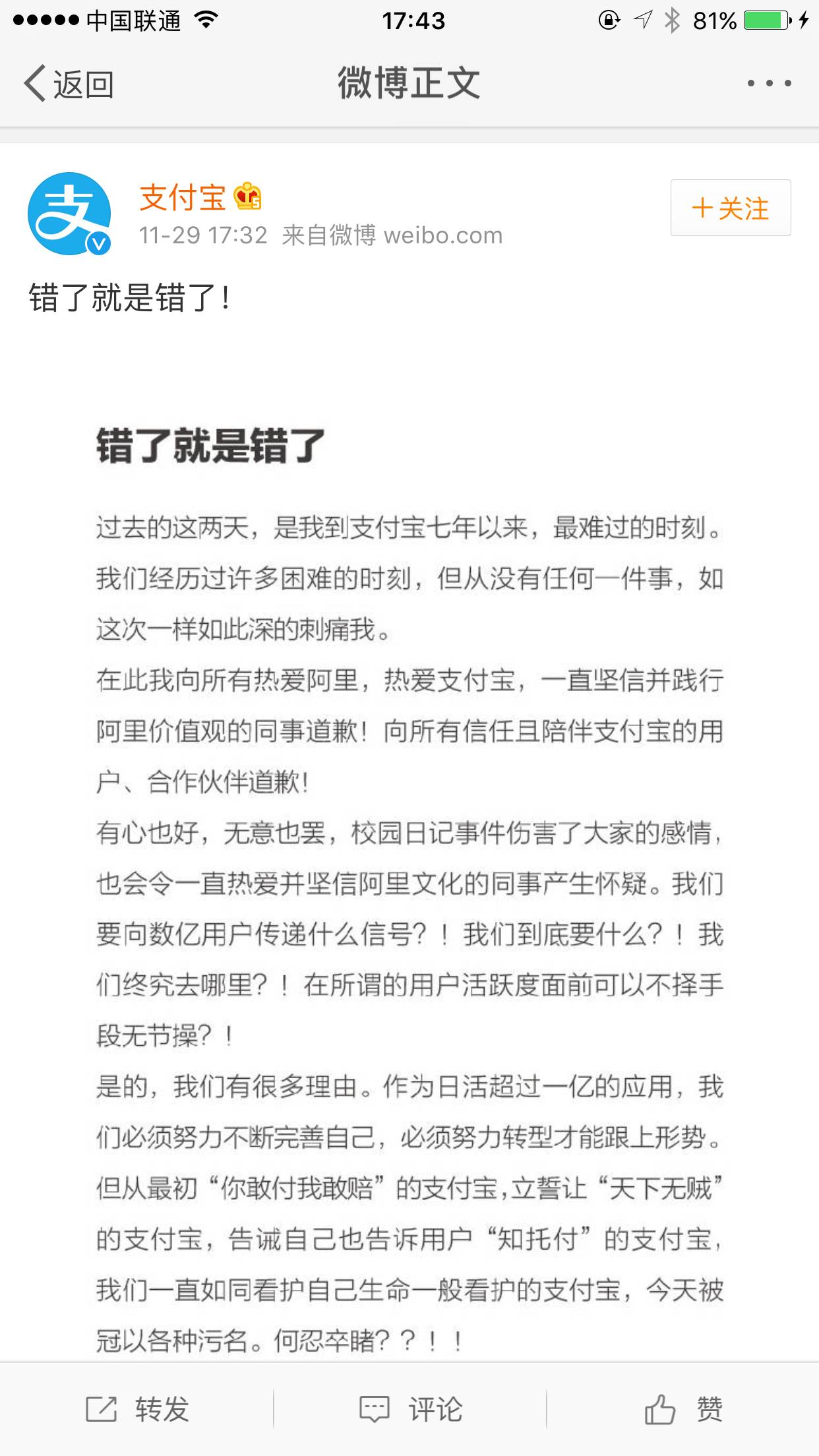 支付宝道歉日活超过一亿的超级应用“支付宝”在经历了最近两天的社交转型风波之后,以一封带有强烈个人风格的自我反思信作结。11月29日17:3……