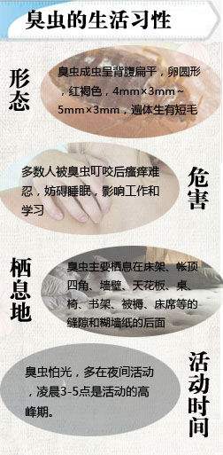 臭虫生活在人居室及床榻的各种缝隙中,白天藏匿,夜晚活动吸血,行动敏捷,不易捕捉。发育为渐变态,生活史有卵、若虫和成虫3期。若虫和成虫……